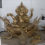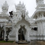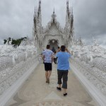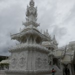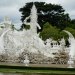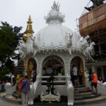 The first day here was on an all-day-long (and I do mean ALL-DAY-LONG!!) trip through Chiang Rai and to the triangle area where Thailand, Burma (Myanmar), and Loas meet. The journey started at 8 a.m. (the driver was half an hour late and I was the last one to be picked up) and took about 4 hours total of driving in a van with a driver who seemed to have a dream of being a NASCAR driver. Rainy roads, be damned! The first place we stopped for a bathroom break was a hot spring. I say hot springs (singular) instead of hot springs (plural) because there was really only one hot spring that anyone could put their hands or feet into. There was a hot spring-like fountain, but that doesn’t count. There was also another small hot spring spot where some of the shopkeepers were cooking eggs in the hot water. The rest of the area was just small tourist shops. We didn’t stay here long and soon headed back out. Finally, we reached our first real destination—the White Temple in Chiang Rai. It was quite a unique and interesting Buddhist structure. I’ll let you see for yourself.