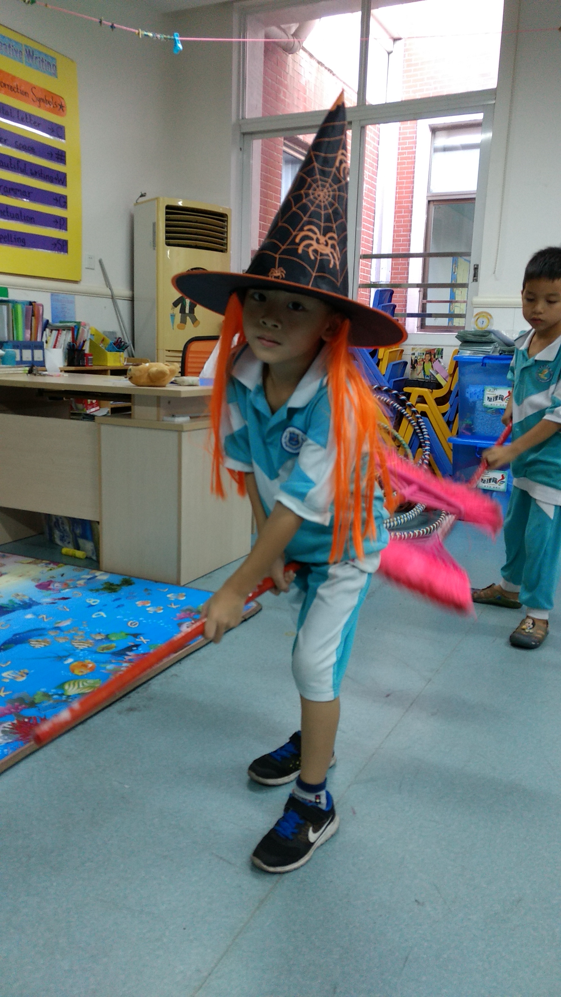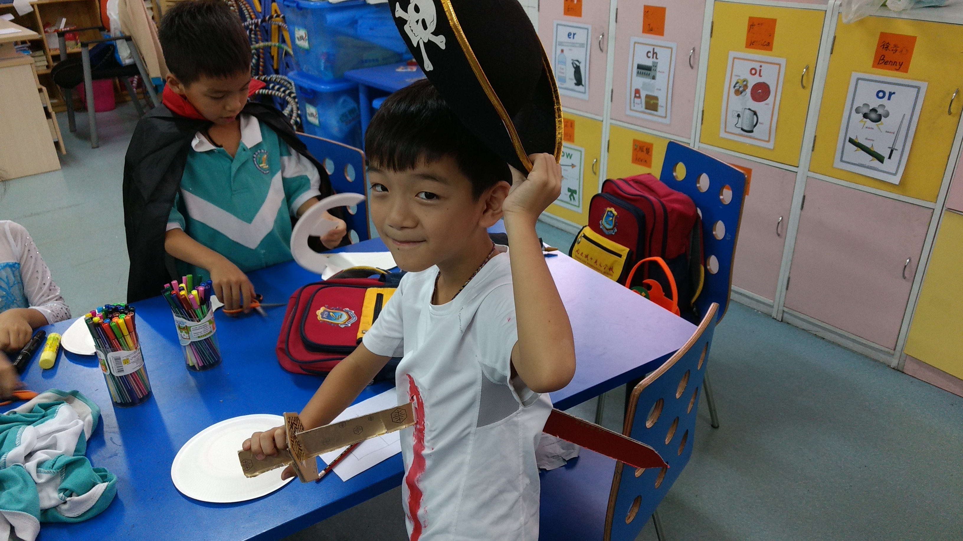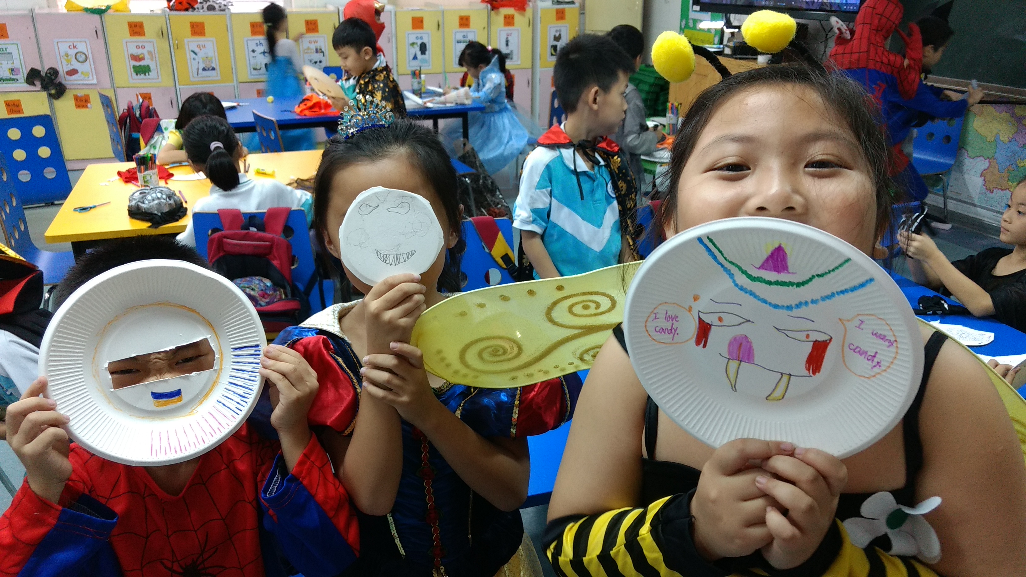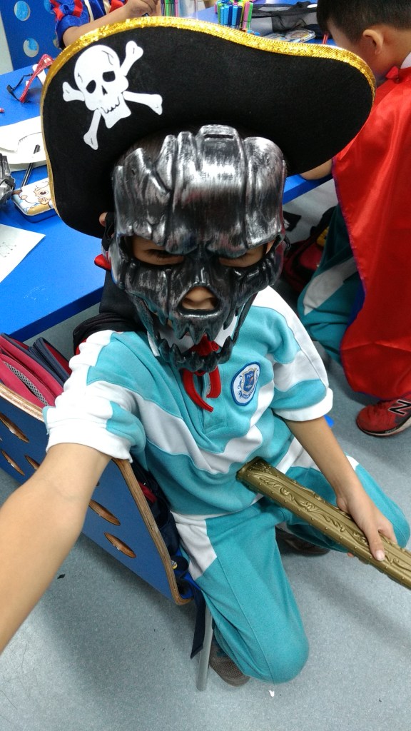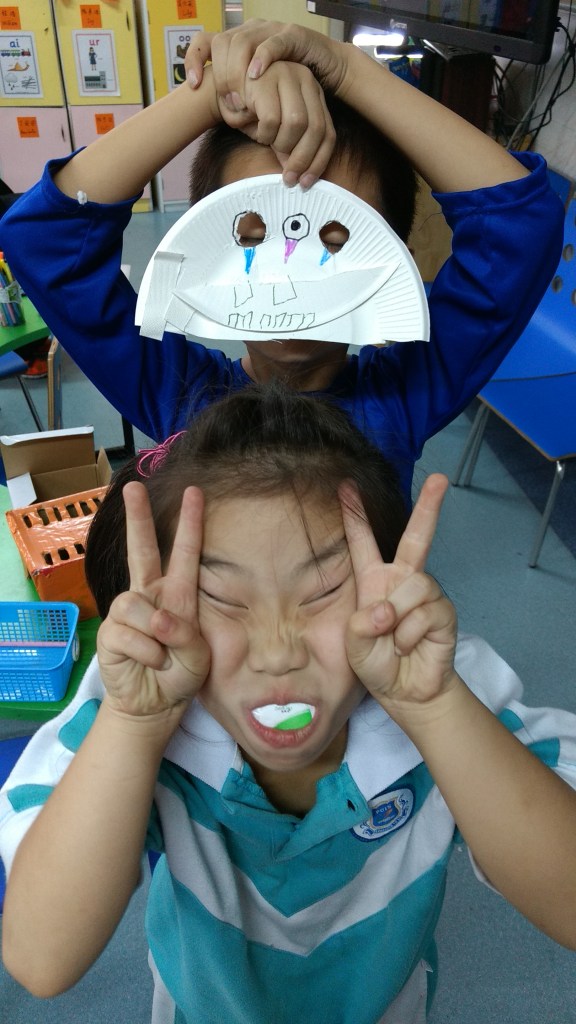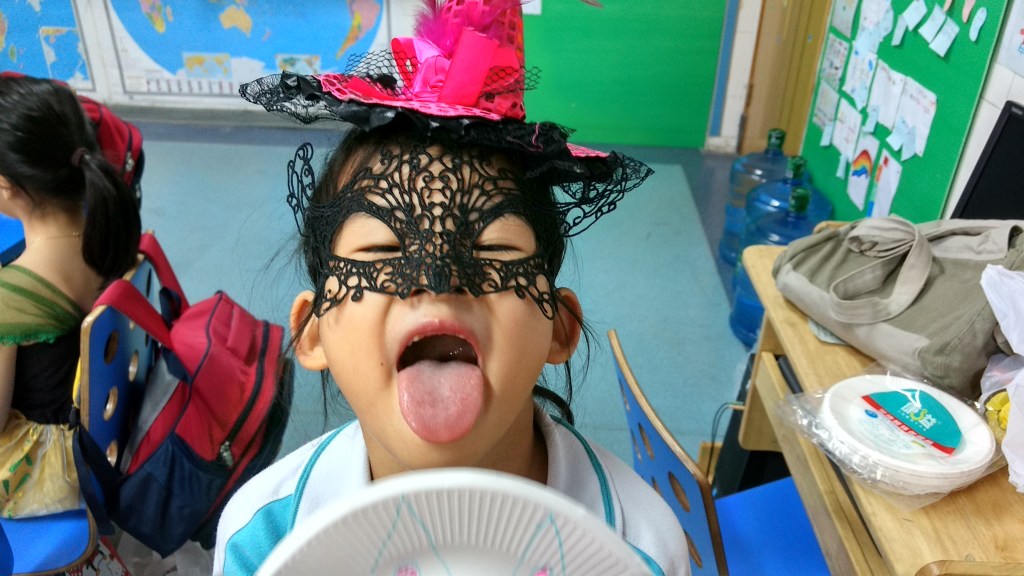 Like pretty much all western holidays that are celebrated here, it’s always the same procedure, meaning that it’s a time to shop (especially Christmas). Since the kids don’t have door-to-door trick-or-treating like we do back home in the USA, they have to make do with celebrating at school. On Friday, the kids brought in their costumes (many of which I remembered from last year), and we had one period in the afternoon for activity time. In our class, I had the kids make their own masks from paper plates. Here were the fruits of their labor.