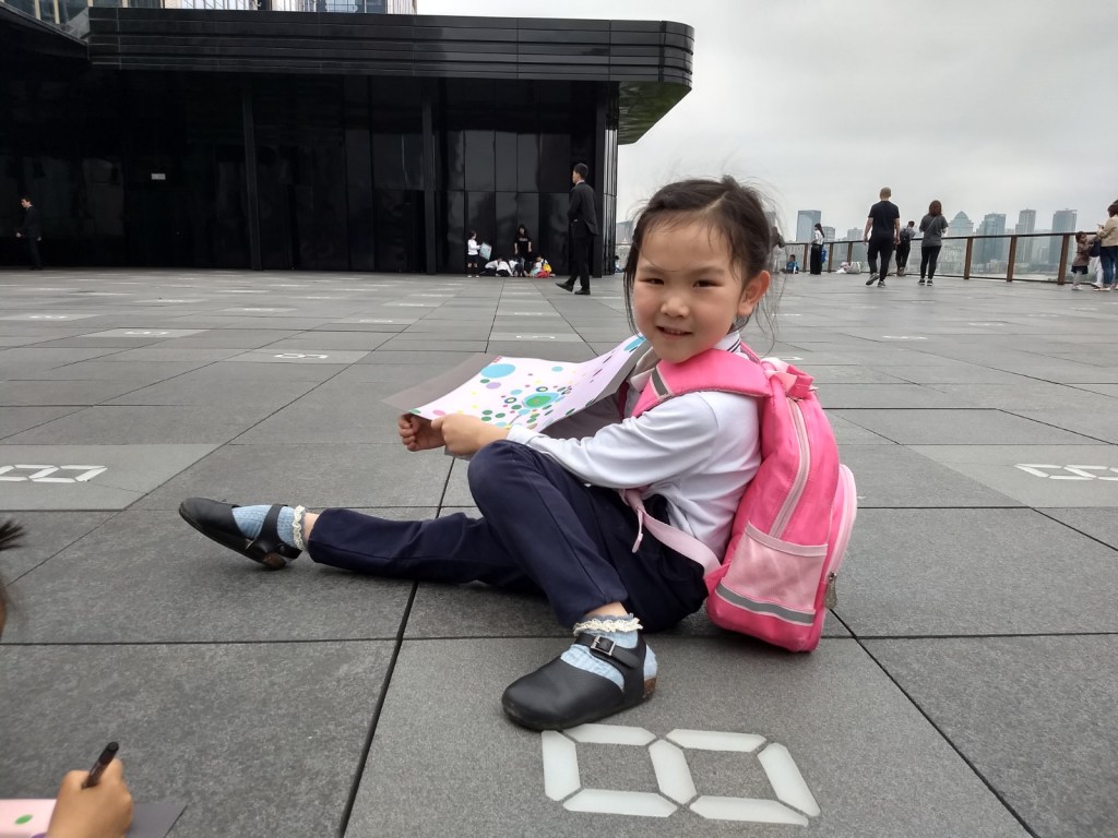 After going through the exhibition, the kids had a craft activity using polka-dots. Our group did their work on the fourth-floor terrace overlooking the Bund.