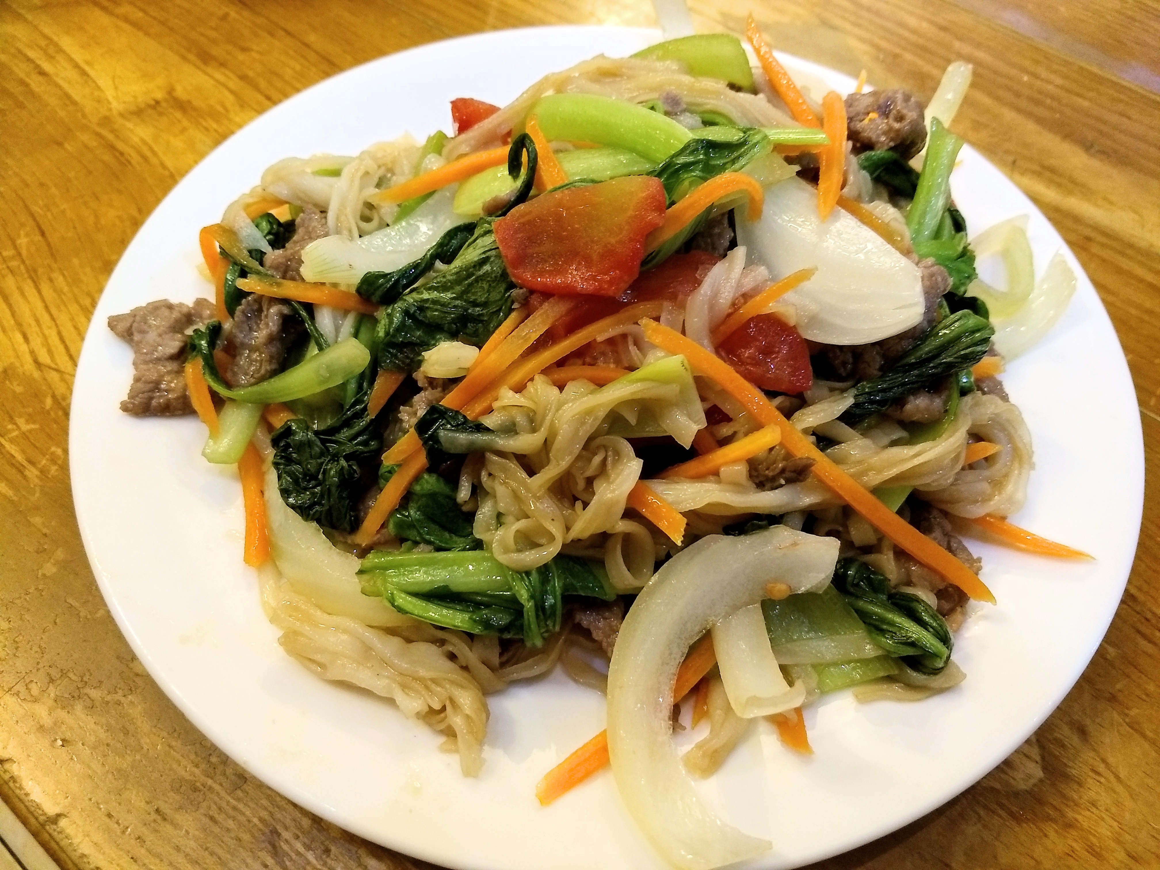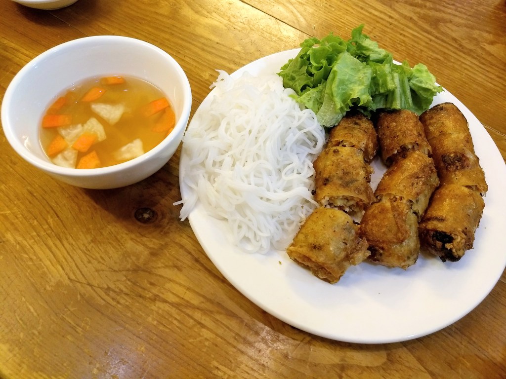 It was a hot, humid evening, but he managed to find us a good place with decent A/C. We ordered a dish that he likes, which is basically a stir-fried version of pho (phở). Of course, I also had to get some fried spring rolls. The dipping sauce for the spring rolls was simple but good, using water, fish sauce, sugar, and something else.