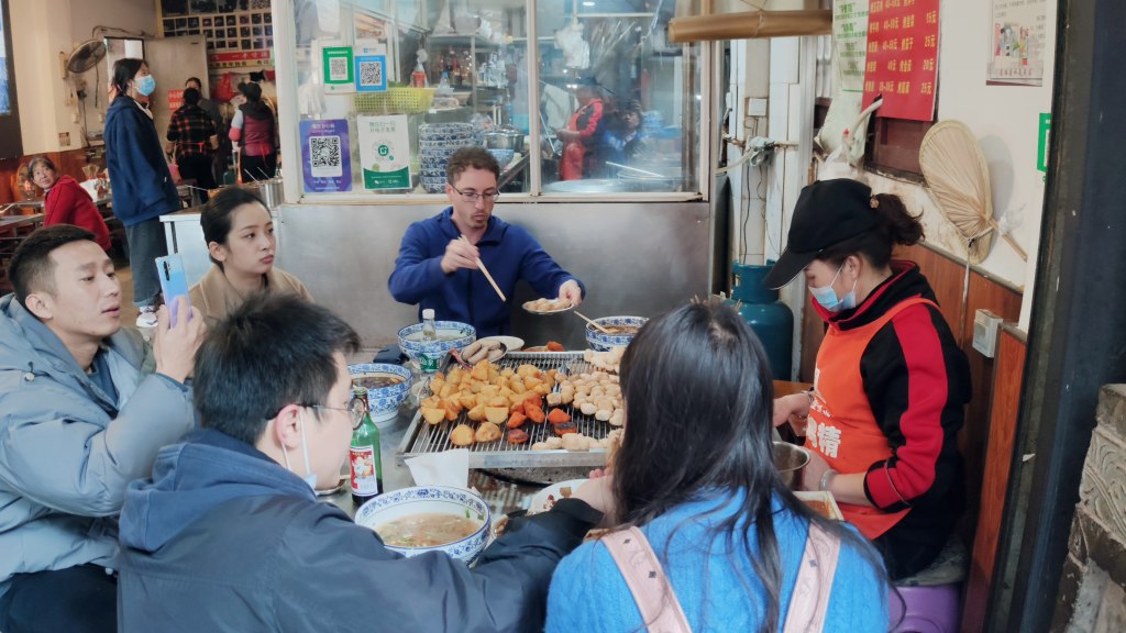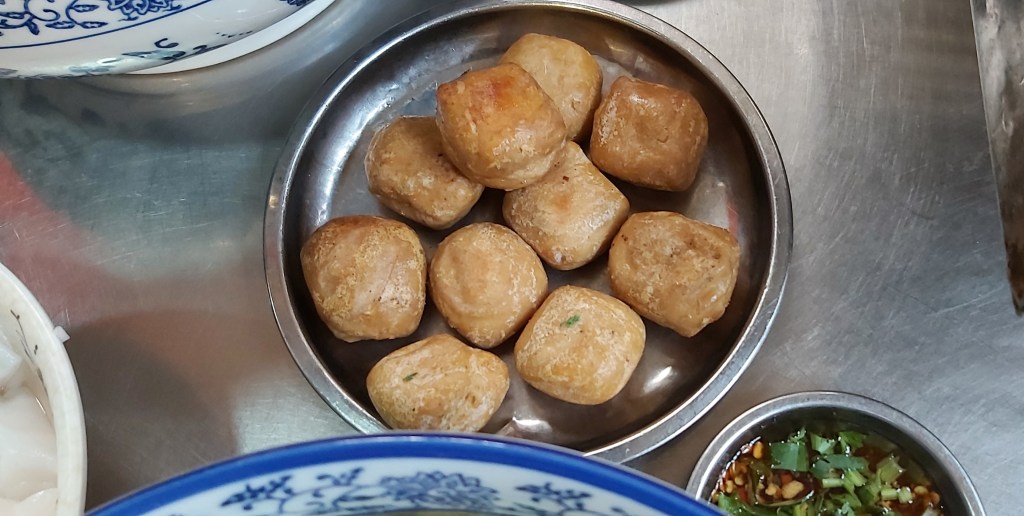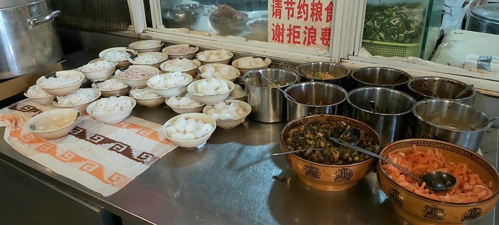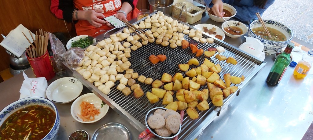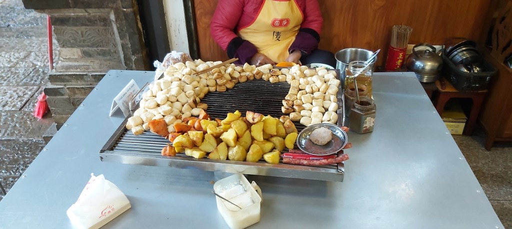 After picking me up at the airport, Jerry drove us two and a half hours to have a late lunch in a town where their claim to fame is their baked tofu that uses special “pure” well water nearby. This baked tofu appeared on an episode of the first season of “A Bite of China.” We ate at a small local place with informal communal dining on little stools. It consisted of a few women seated at grilling stations with many pieces of tofu to bake, as well as potatoes, sweet potatoes, and some sausage.