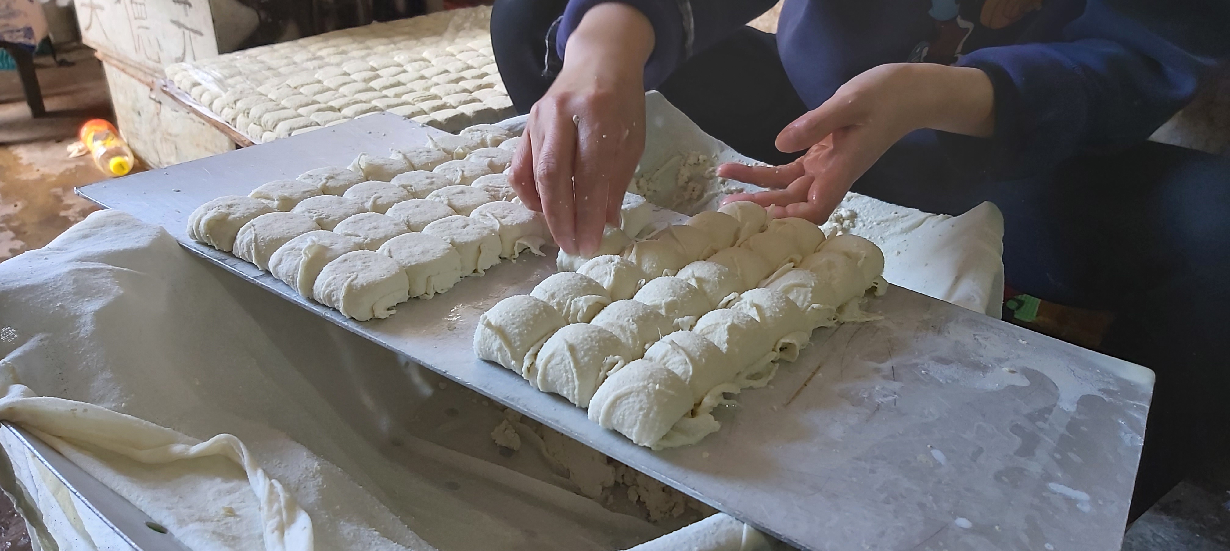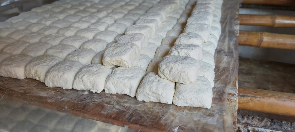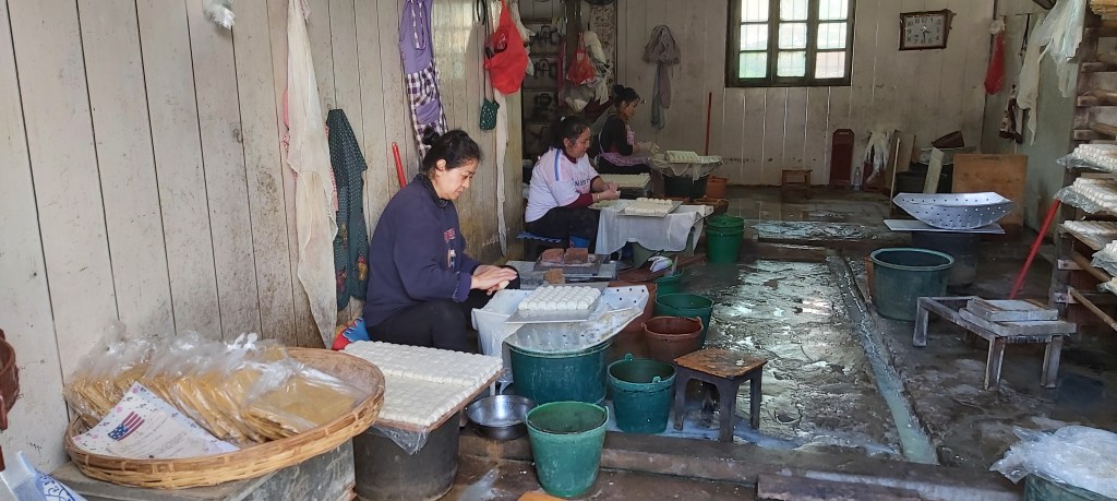 After a filling lunch, he then took me to a nearby area to show me the well where the locals retrieve their water from. Along the way, we found a place where some women were preparing the tofu, rapidly shaping and then wrapping the soft tofu into blocks before being shelved to dry.