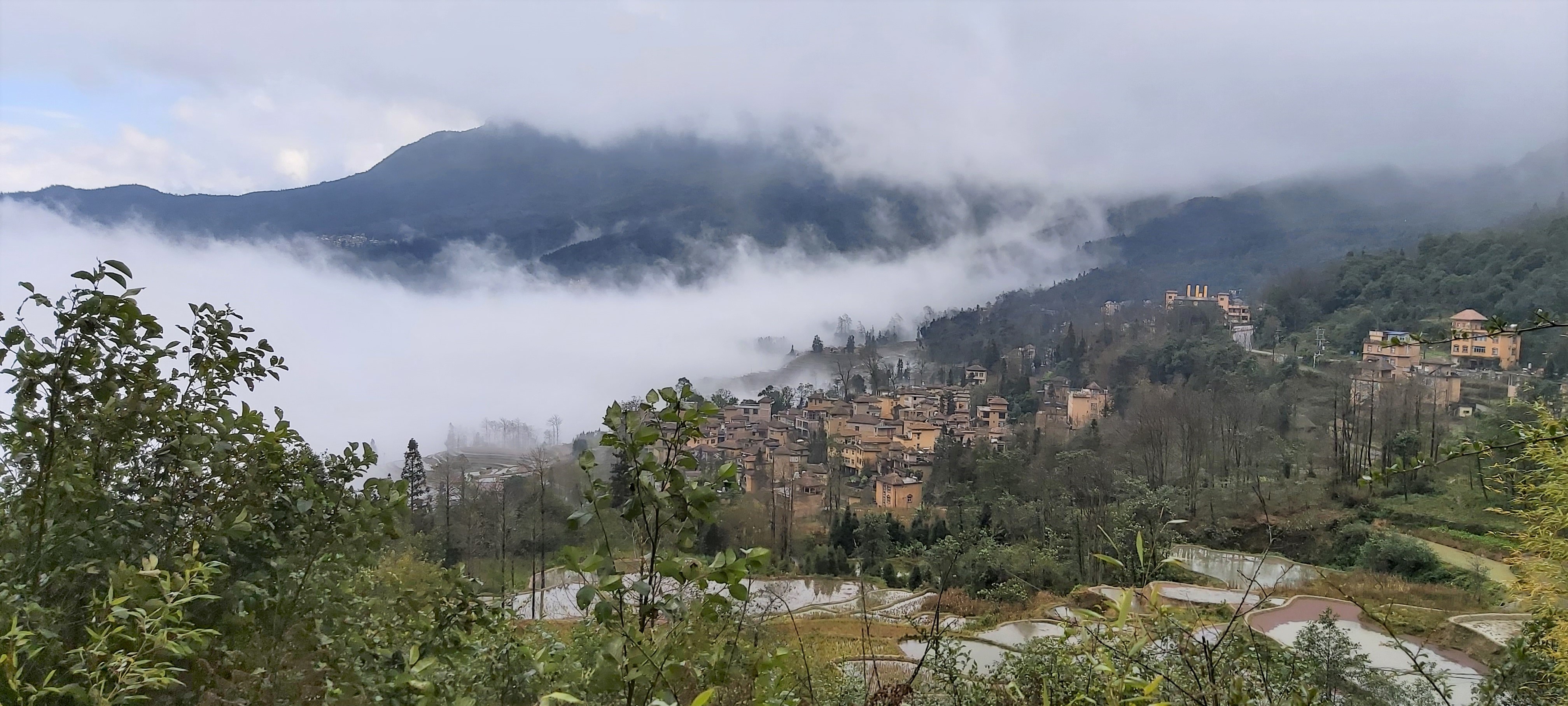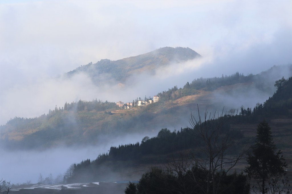 By the time we finished lunch, the weather seemed to be improving, so we high-tailed it out of there and headed toward the Azheke 阿者科 (ā zhě kē) village, known for its “mushroom” houses. On the way there, we stopped for some photos of the valley as the clouds were dissipating.