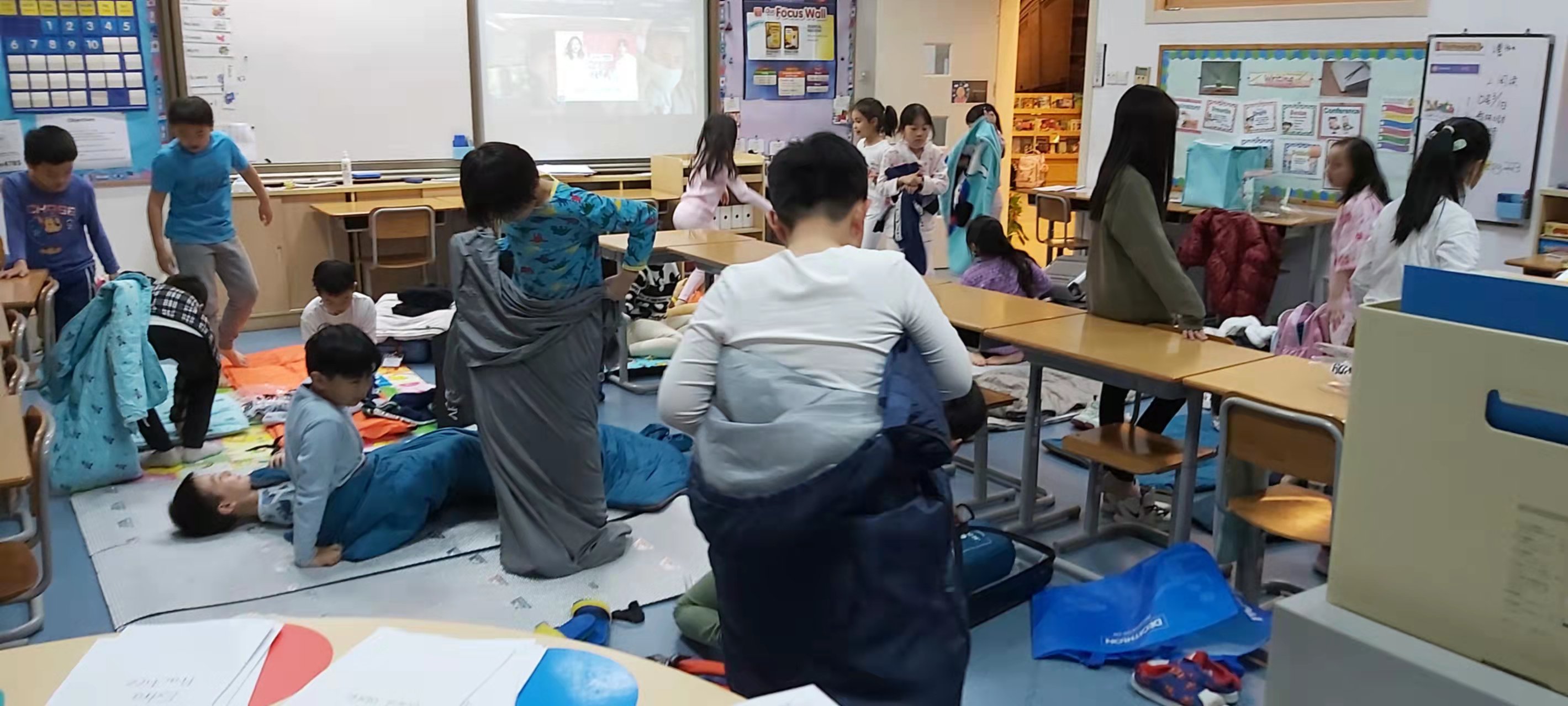 Teachers were told to sleep in the classroom with students, but some teachers (including myself) refused to do so. I found a room in the art/dance class hallway that had carpeting and some pillows, so one of my Grade 3 team members and I stayed there both nights. The first night, I didn’t sleep at all. The second night, I managed to sleep a bit (this time, I managed to grab some yoga mats from the first floor and an extra floor pillow in the room to try to help). The local CDC supplied sleeping bags (for all) and some floor pads (for students), which didn’t do much to help with the hard floor. The ayis (cleaning ladies) and school staff helped with bringing in supplies. Parents were told to bring a supply back for their child to leave at the school gate.