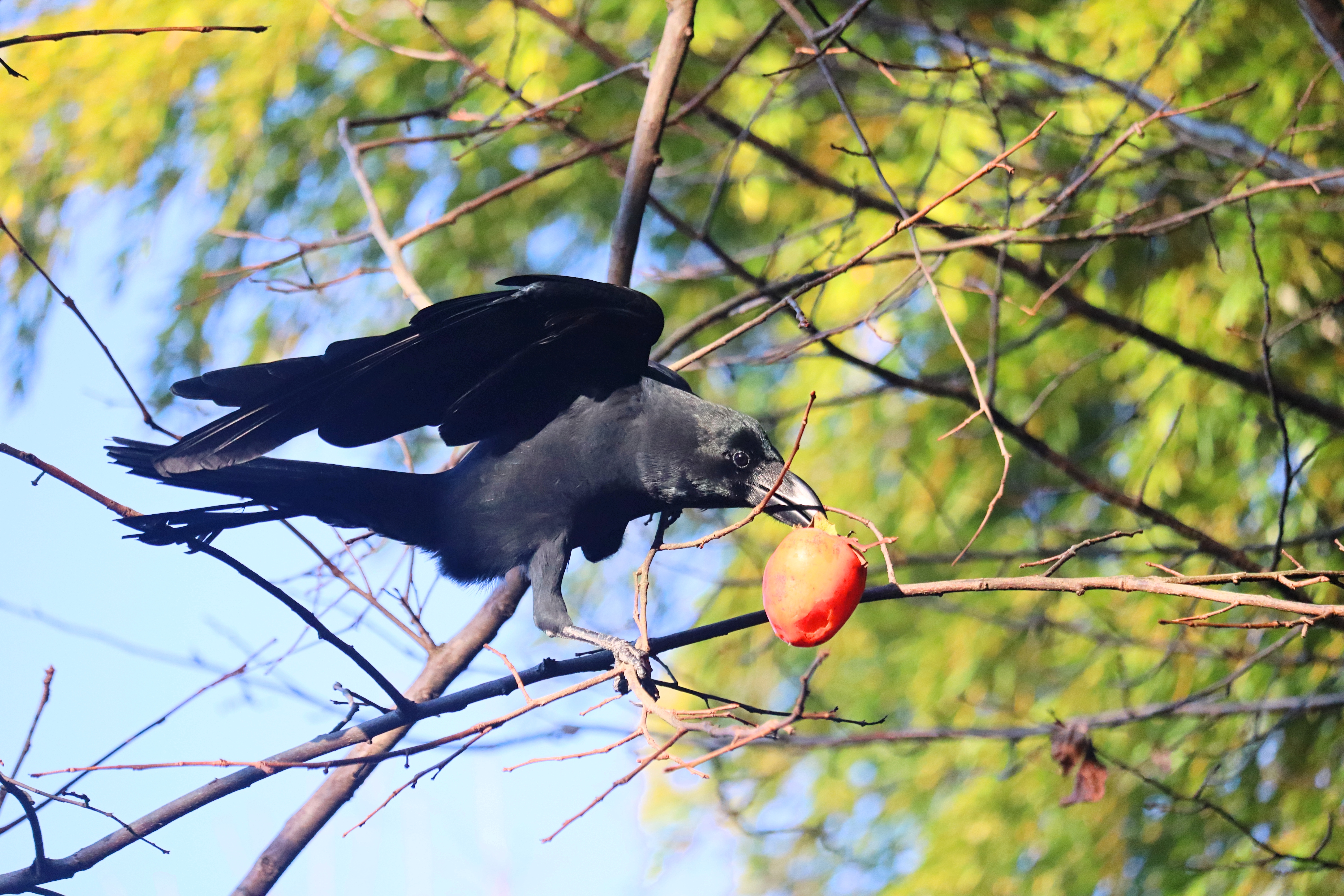 Not long after I walked past the first tree and took some more photos, I heard the crow demanding satisfaction after the first fruit fell from the tree.