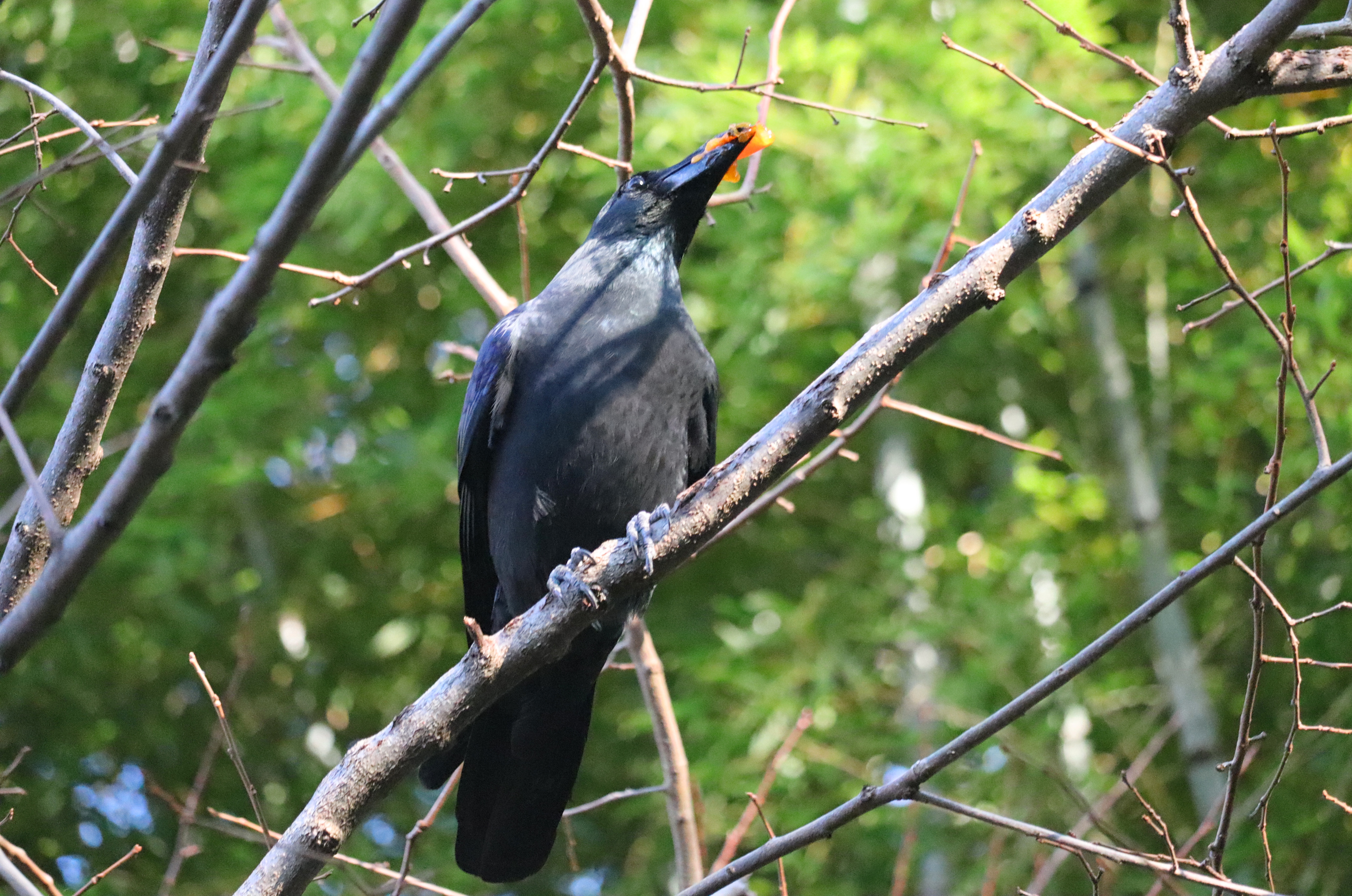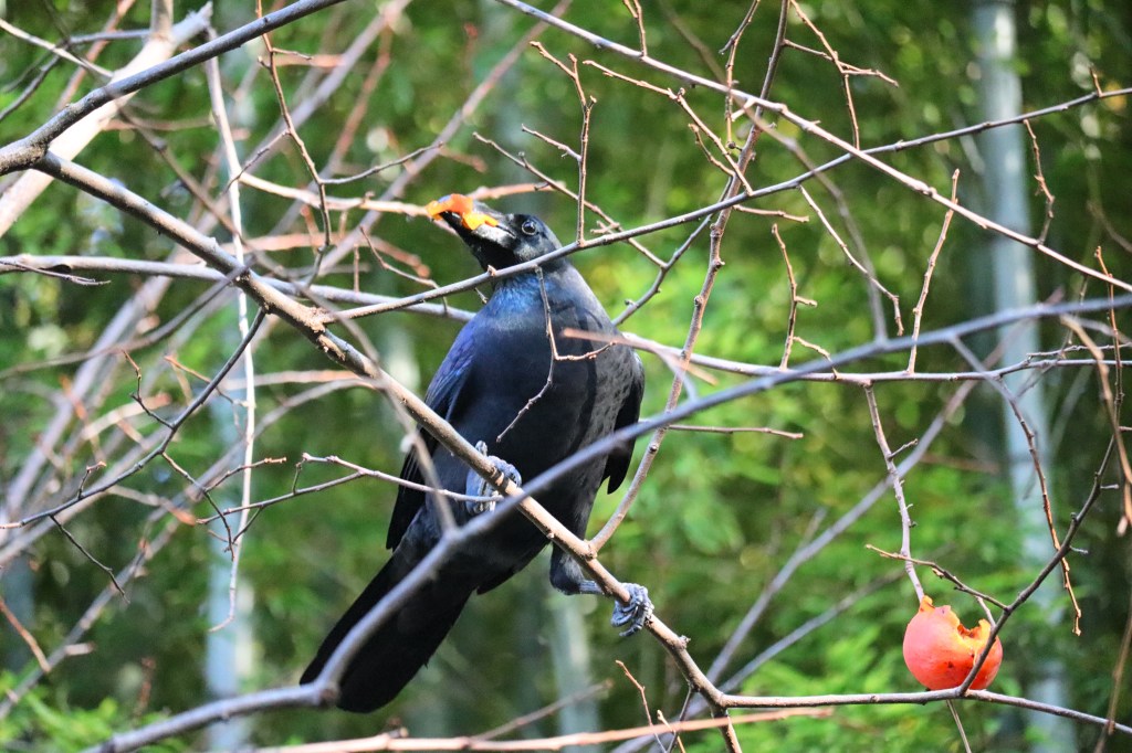 After just coming out of the bamboo area, I heard a loud “squawk!” close by. I looked up into a nearby tree and saw what looked like a crow, trying in earnest to get at some fruit.